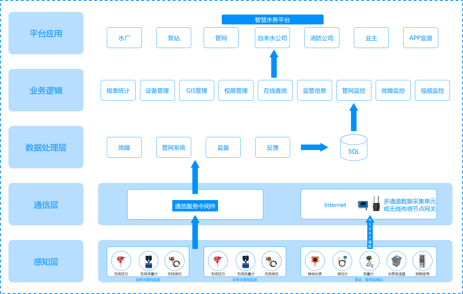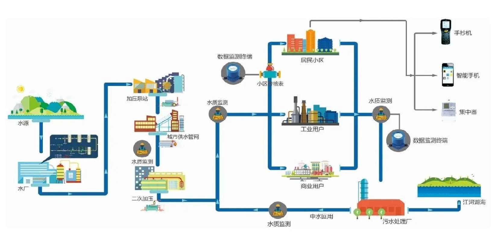 互聯(lián)網(wǎng)+產(chǎn)業(yè)的結(jié)合越來越深入人心,智慧水務(wù)也應(yīng)運(yùn)而生。智慧水務(wù)通過數(shù)采儀、無線網(wǎng)絡(luò)、水質(zhì)水壓表等在線監(jiān)測設(shè)備實(shí)時感知城市供水系統(tǒng)的運(yùn)行狀態(tài),并采用可視化的方式有機(jī)整合水務(wù)管理部門與供水設(shè)施,形成“城市水務(wù)物聯(lián)網(wǎng)”, 并可將海量水務(wù)信息進(jìn)行及時分析與處理,并做出相應(yīng)的處理結(jié)果輔助決策建議,以更加精細(xì)和動態(tài)的方式管理水務(wù)系統(tǒng)的整個生產(chǎn)、管理和服務(wù)流程,從而達(dá)到“智慧”的狀態(tài)。為保證供水工作的科學(xué)性提供數(shù)據(jù)分析,可及時發(fā)現(xiàn)管網(wǎng)故障,提高維護(hù)效率、降低損失,保障輸水、供水質(zhì)量,達(dá)到科學(xué)預(yù)警,減少成本,提高效率的目的。